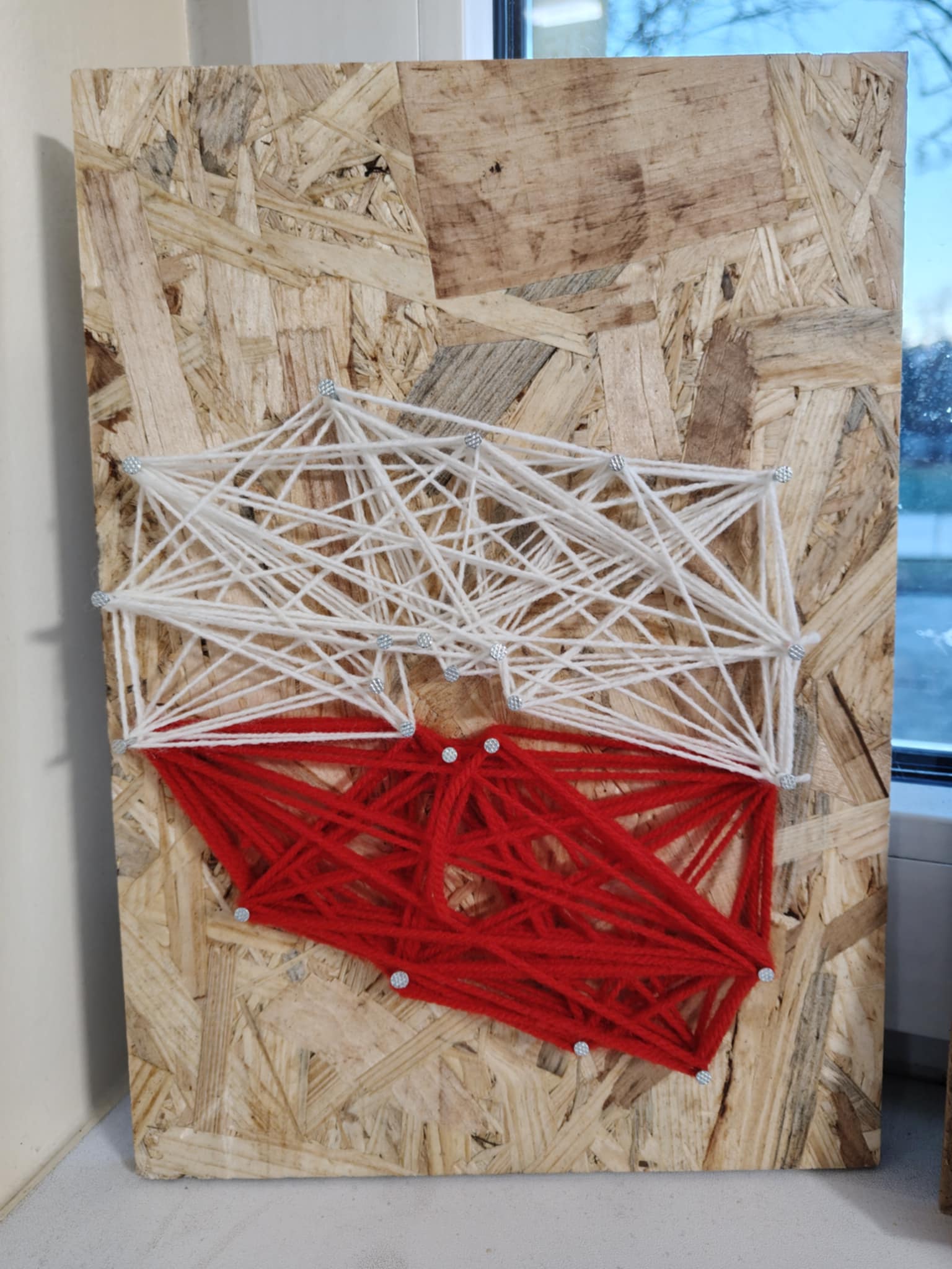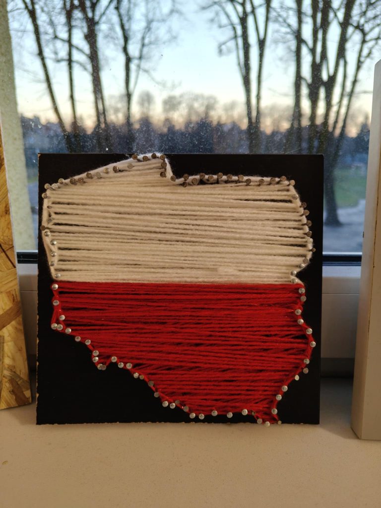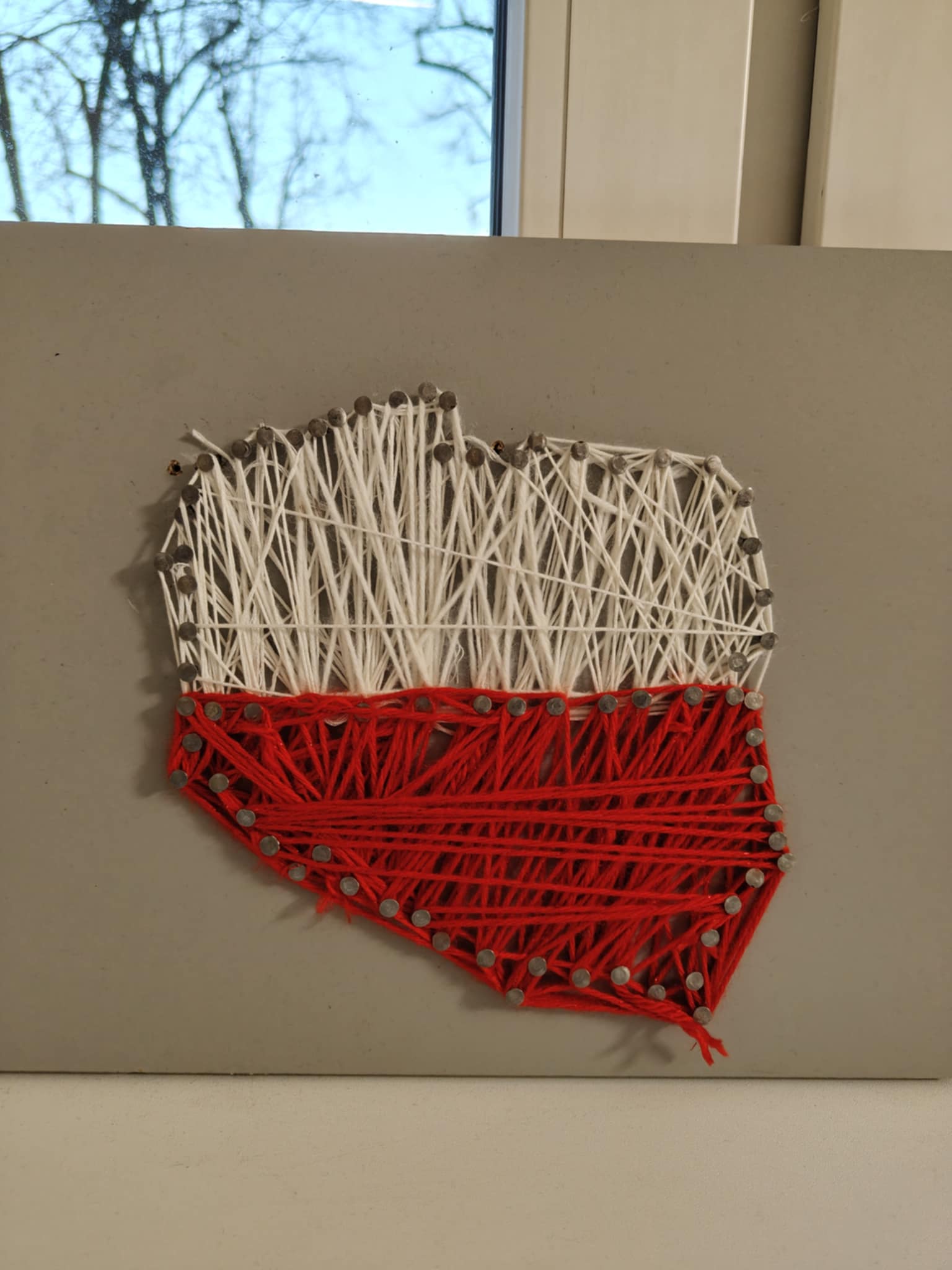Podczas zajęć plastycznych w klasie 7 dzieci pracowały techniką string art, czyli tworzenia obrazu za pomocą naciąganej włóczki. Zadaniem uczestników było wykonanie mapy POLSKI. Dzieci najpierw zapoznały się z konturem mapy, a następnie – korzystając z przygotowanego szablonu – odwzorowały go na kartonie. Kolejnym etapem było tworzenie kompozycji z włóczki: owijanie, przeplatanie i napinanie nici tak, aby wypełnić całą mapę. Zajęcia rozwijały sprawność manualną, koncentrację, wyobraźnię przestrzenną oraz cierpliwość. Wszystkie dzieci wykonały swoje prace z dużym zaangażowaniem wykorzystując narzędzia zakupione w ramach laboratoriów przyszłości.