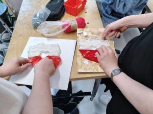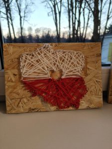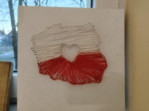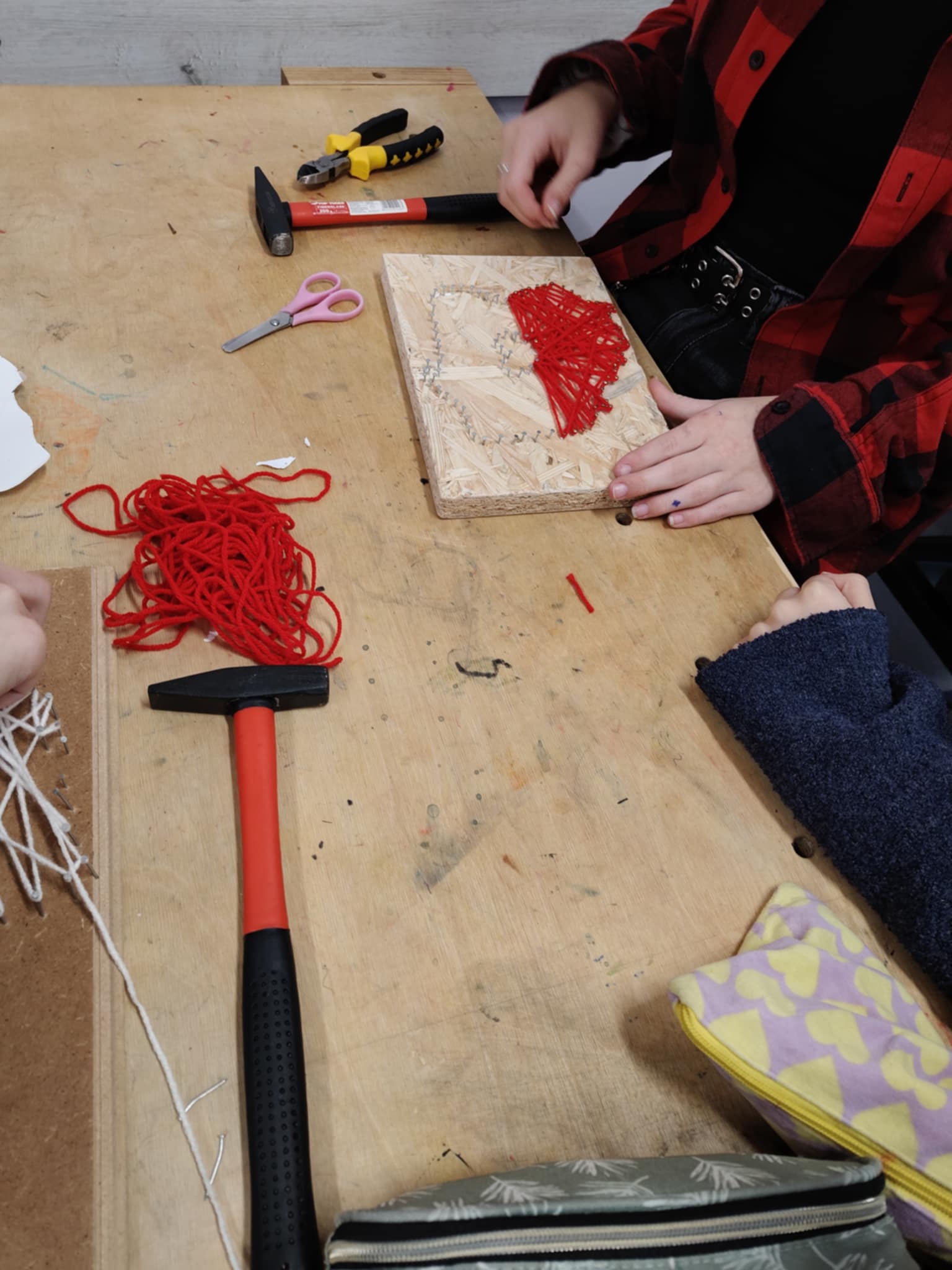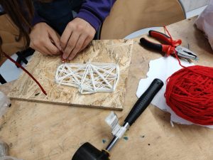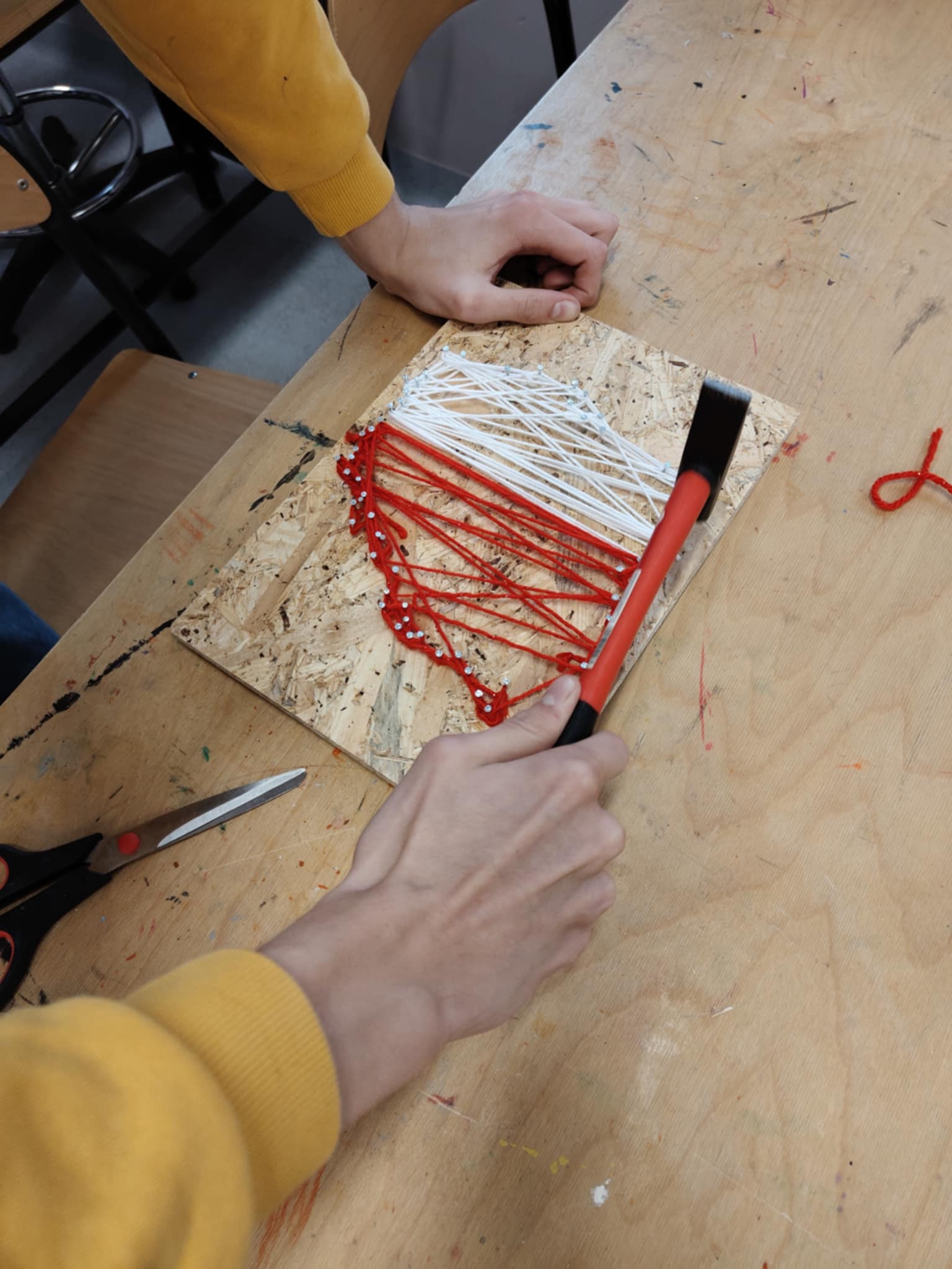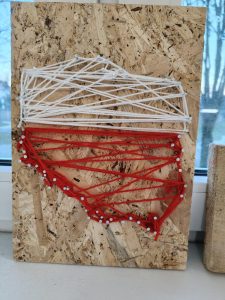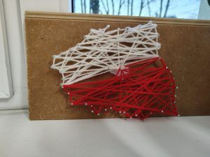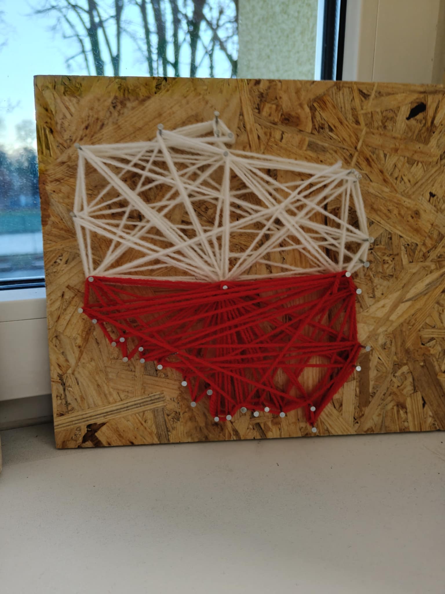 Podczas zajęć plastycznych w klasie 7 dzieci pracowały techniką string art, czyli tworzenia obrazu za pomocą naciąganej włóczki. Zadaniem uczestników było wykonanie mapy POLSKI. Dzieci najpierw zapoznały się z konturem mapy, a następnie – korzystając z przygotowanego szablonu – odwzorowały go na kartonie. Kolejnym etapem było tworzenie kompozycji z włóczki: owijanie, przeplatanie i napinanie nici tak, aby wypełnić całą mapę. Zajęcia rozwijały sprawność manualną, koncentrację, wyobraźnię przestrzenną oraz cierpliwość. Wszystkie dzieci wykonały swoje prace z dużym zaangażowaniem wykorzystując narzędzia zakupione w ramach laboratoriów przyszłości.